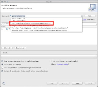 完成上一個步驟後,點選單列的「Help」→「Install New Software」開啟 Install 對話視窗。這時候可以在「Work with:」的下拉選單中找到剛剛加入的 CDT Site,如下圖。選取之後會出現安裝內容,我只勾選了「CDT Main Features」,按視窗右下角的「Finish」按鈕,接著就是照著畫面的提示操作了。