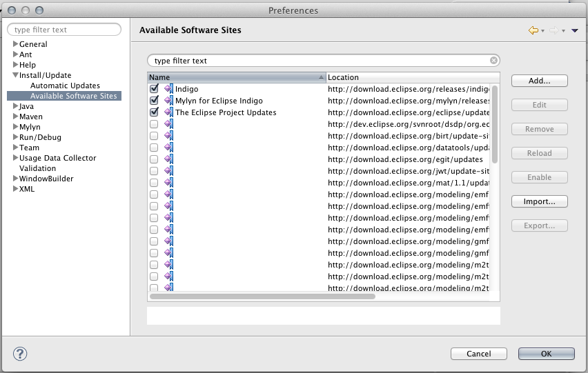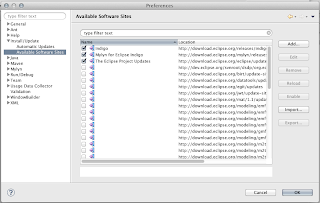 如果看到的畫面沒有像上圖那麼多的空白選項,那麼應該是剛安裝好 Eclipse, 還在從 Server 上抓取清單。放著 Eclipse 幾分鐘不動,它會自動於背景抓取選項清單,再打開「Available Software Sites」就可以看到如上畫面了。