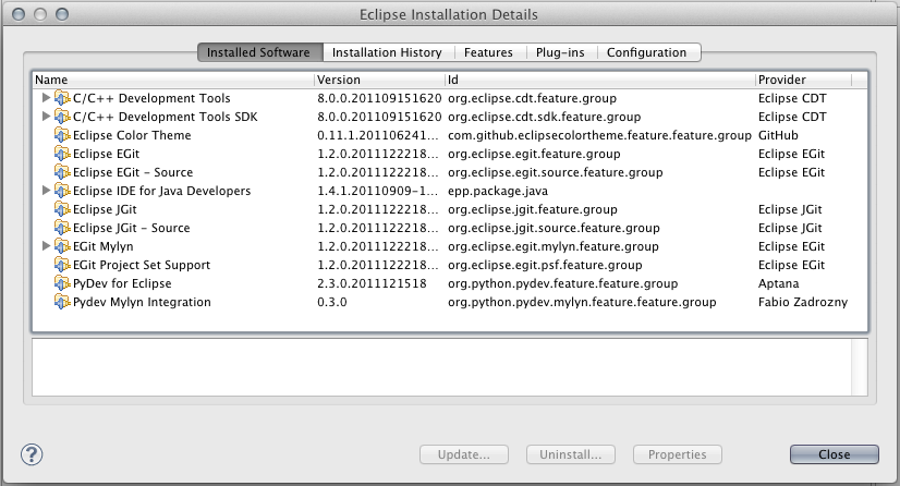 還有一點要抱怨的是,Eclipse 裡的術語眾多,頭字語滿天飛,CDT, RAP, ATF 什麼的一堆,我要裝個 Git 還得先搞懂 EGit 跟 JGit 到底有什麼差別。術語和頭字語的問題在程式語言開發的領域中在所難免,這我可以理解,可是 Eclipse 的世界中硬是比其他開發環境多出許多,一眼看去彷彿有字天書。工具是用來解決問題的,不過這下反而製造了更多的問題讓使用者學習。寫到這裡我突然想感謝 Microsoft 沒有在 Visual Studio 的安裝介面選項中將「Microsoft SQL Server」縮寫成 MSS。